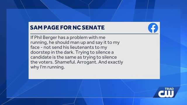 4+ hour, 15+ min ago (192+ words) Senate Majority Whip Amy Galey, who represents Alamance and Randolph counties, visited Rockingham County Sheriff Sam Page's home the night before the candidate filing period to try to convince him not to run for Senate, according to our NBC News partner WRAL. Page said he was not home at the time and that Galey left a letter asking him not to file. Sen. Galey told WRAL that her actions were unusual but required. WXII has reached out to her for comment and has not received a response. On his social media, Page responded to the incident saying, "If Phil Berger has a problem with me running, he should man up and say it to my face " not send his lieutenants to my doorstep in the dark. Trying to silence a candidate is the same as trying to silence the voters....